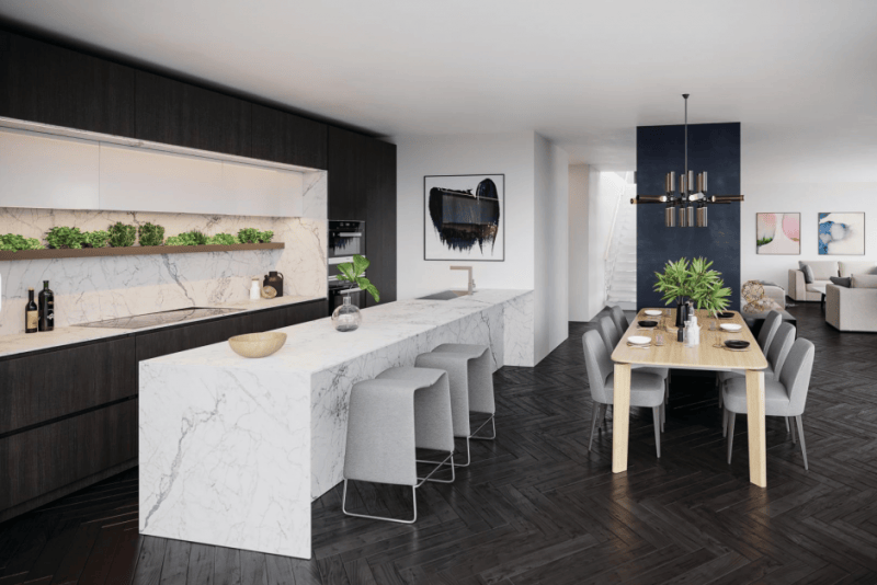 在3号楼的设计中,“实用与美学的平衡”是核心:647平方英尺的一房户型优化收纳空间,188平方英尺的两房户型注重动线平方英尺的三房户型则强调家庭互动区域。建筑公共空间融入意大利式优雅——大堂采用温暖的木质材质与柔和灯光,公共艺术装置以几何线条为主,搭配社区内的综合音乐厅与图书馆,让简约设计中透出浓厚的文化氛围。卡斯蒂利亚还亲自挑选室内材料,从地板到洁具都兼顾耐用性与审美性,完美适配新移民“长期居住”的核心需求。
