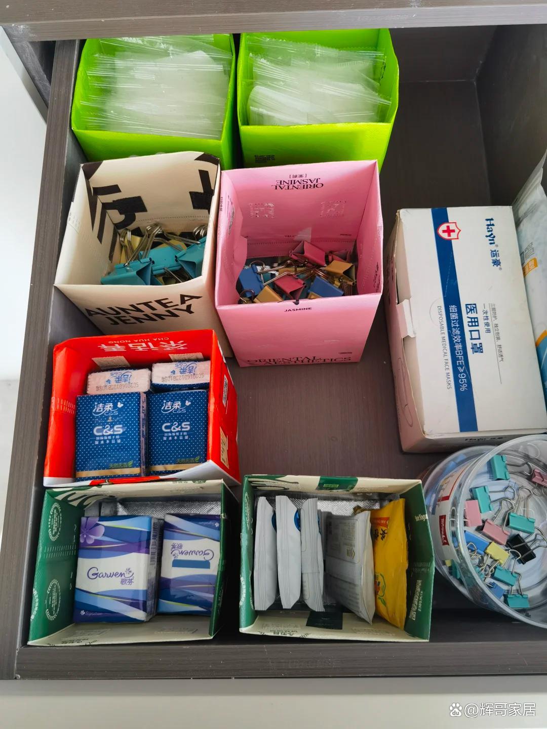 整理一下就能变成一个收纳盒,可以放在抽屉里,不要求严丝合缝,但却能把杂物分类摆放,这样一来打开抽屉也不会乱了。