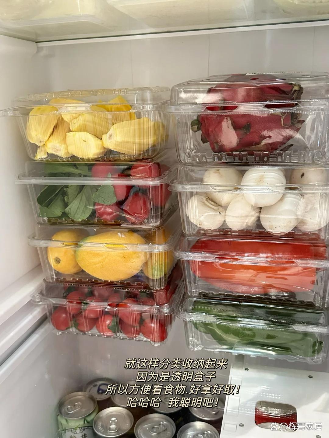 买水果剩下的透明水果盒也不会随便扔掉,可以利用这些盒子收纳冰箱里的食材,无论是蔬菜、鸡蛋放在透明盒里,