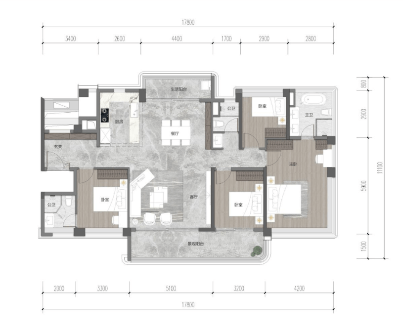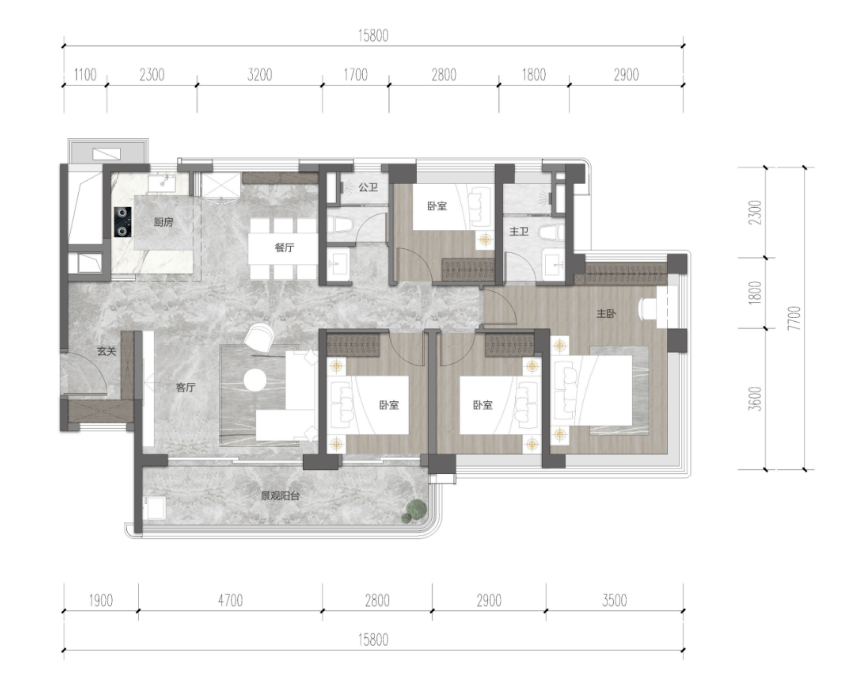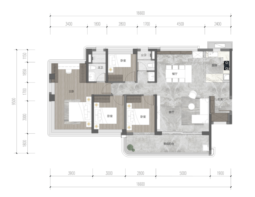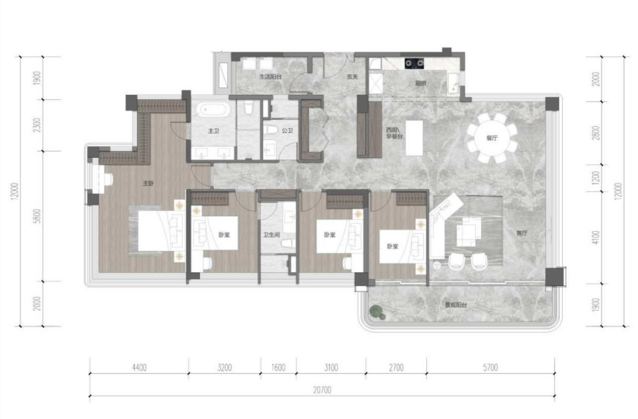 116平方米户型则在95平的基础上进行了全面升级。双阳台配置是其一大亮点,一个连接客厅用于休闲观景,一个连接厨房用于洗衣晾晒,功能分区明确,互不干扰。客厅开间更大,容纳更多人聚会也不显拥挤。主卧套房设计,带有独立卫生间和步入式衣帽间,私密性和舒适度大幅提升。儿童房和老人房的尺寸也更加宽裕,足以放置书桌和大床。整体来看,116平户型兼顾了功能实用性与居住舒适度,是多人口家庭的理想之选。