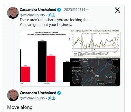 伯里还通过推文附带的图表进一步阐述其观点,他对比了Alphabet、亚马逊与微软在2018至2022年云业务板块的增长态势与当前阶段的差异,暗指当前AI热潮的投资回报率远未达市场预期。这一论调与市场上与日俱增的忧虑形成呼应:如同互联网泡沫初期对光纤领域的大规模过度投资,当前AI泡沫中的头部企业未来或许可能遭遇危机。