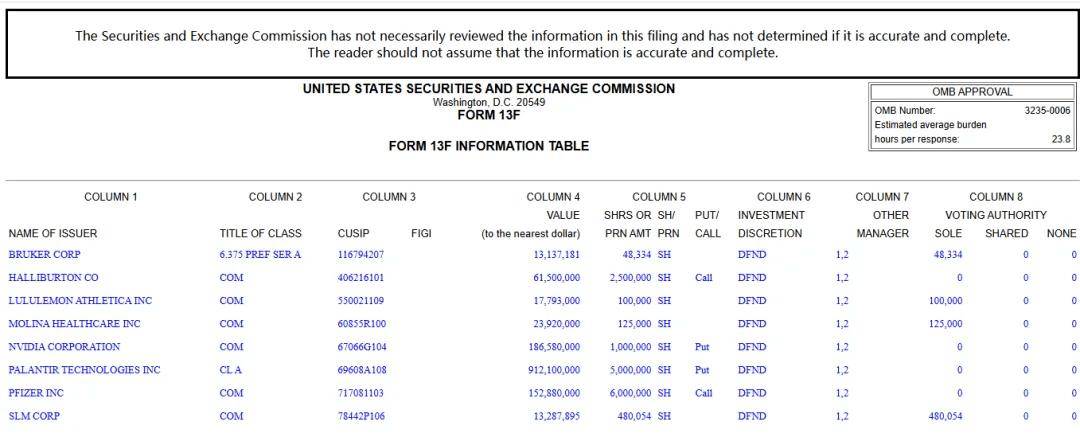 从Scion资产管理公司的13F文件内容来看,前半部分较为平淡,主要披露了对Bruker、Lululemon、SLM以及莫利纳医疗等传统小盘股的持仓情况。但文件后半部分却暗藏玄机:一方面,持仓全部由看跌期权与看涨期权的组合构成;另一方面,核心看跌期权标的精准指向当前AI狂热的两大代表性企业——Palantir和英伟达。