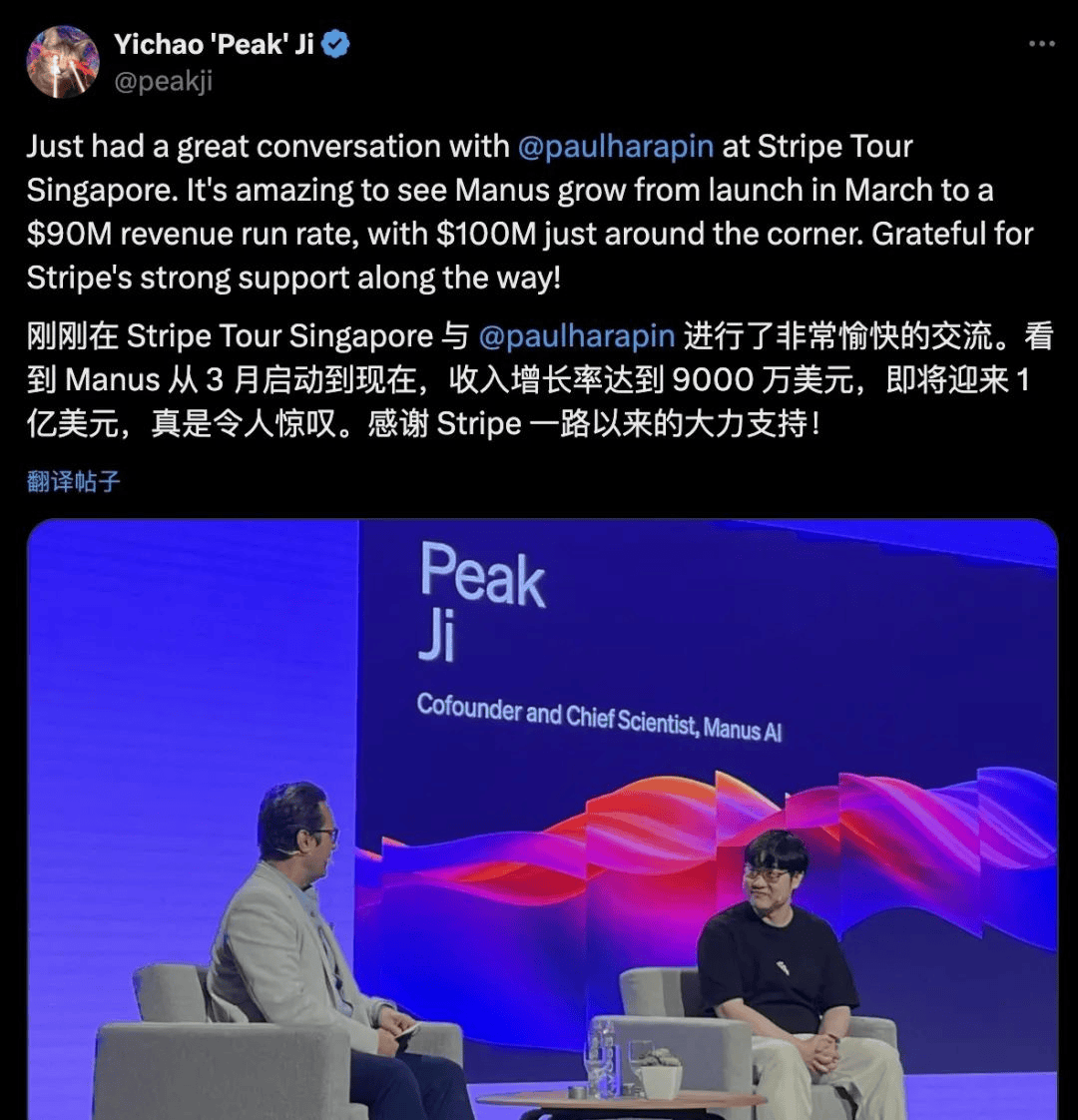 近日,Manus 联合创始人、首席科学家季逸超发文透露,Manus 自从 3 月启动至今,母公司「蝴蝶效应」预计年化营收已达 9000 万美元。