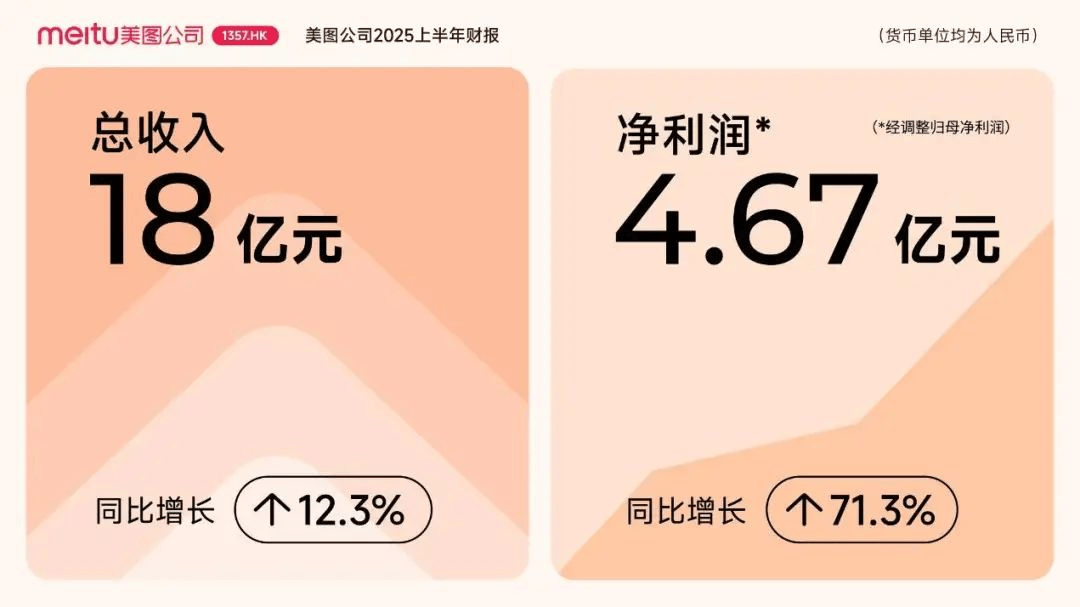 8 月 18 日,美图公司披露 2025 上半年财报:总收入 18 亿元(人民币,下同),同比增长 12.3%。经调整后归属于母公司权益持有人净利润 4.67 亿元,同比增长 71.3%。