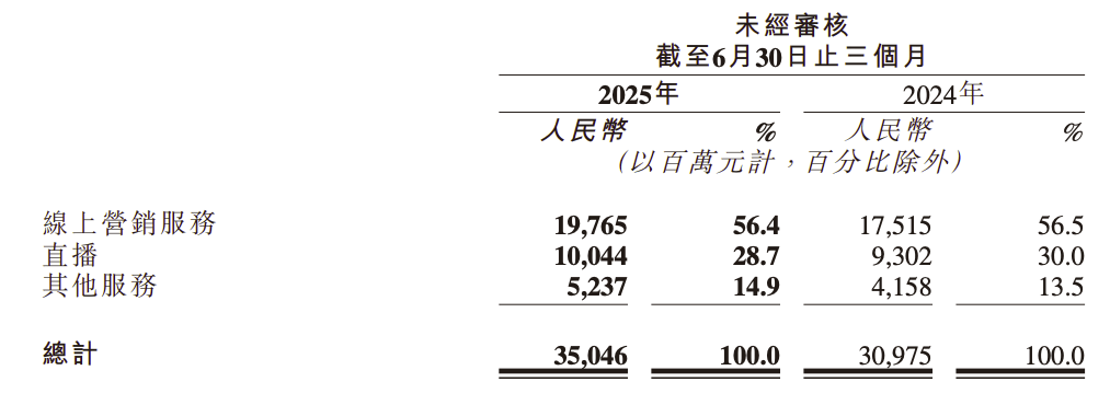 快手在港交所发布2025年第二季度财报。财报中披露,公司总营收达 350 亿元,同比增长 13.1%;经调整净利润达 56 亿元,同比增长 20.1%。毛利率和经调整净利润率双双突破历史峰值。线上营销服务、直播及其他服务(含电商及可灵)对收入的贡献占比分别为 56.4%、28.7% 和 14.9%。