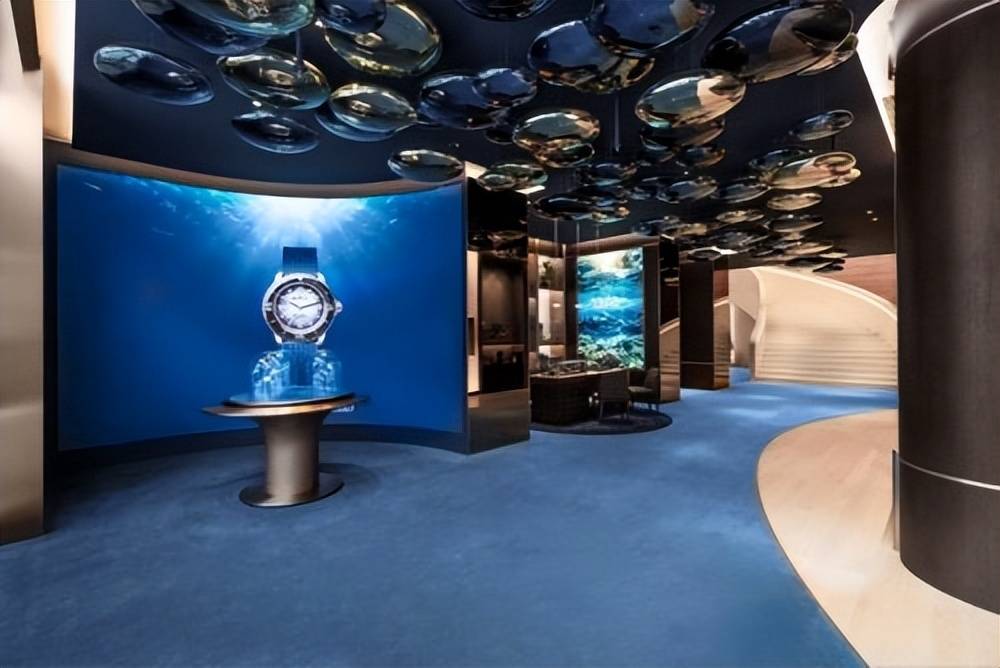 一层以蓝色为主基调打造沉浸式空间,金属气泡浮动,光影交错层叠,宛若置身与五十噚紧密相连的海底世界。同时设有售后服务中心,为腕表提供全方位的检测、保养及维护,让尊贵的客户体验大师级的技艺与终身守护的承诺。