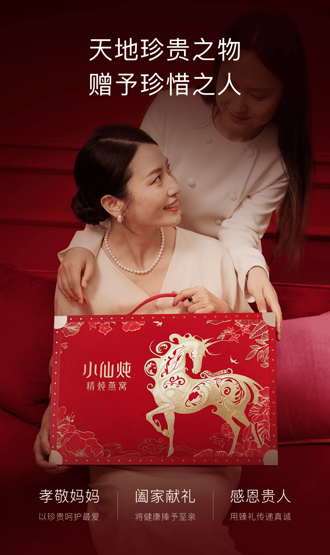 而中国人的情感表达向来含蓄内敛,一句“保重身体”的口头叮嘱,远不及一份承载心意的礼物来得真切。这份细腻的情感需求下,小仙炖“龙马安康”礼盒更成为适用于不同人群表达心意的具象载体。每一个礼赠场景背后,都是“在意”的具象表达,小仙炖让每一份健康心意都有处可寄。