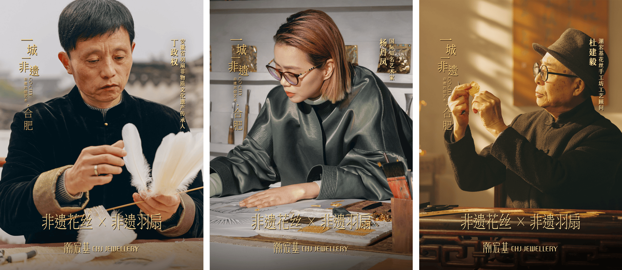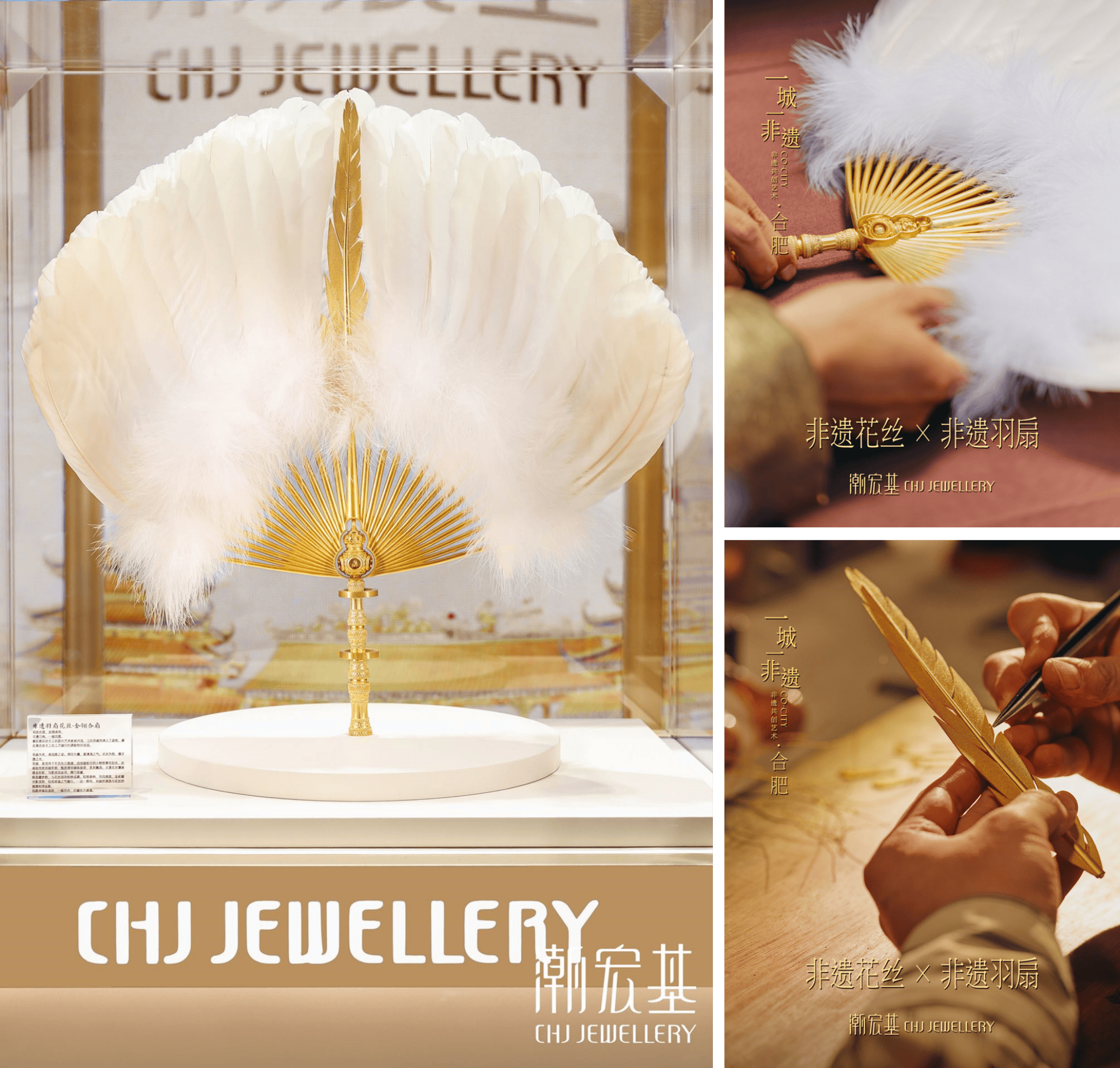 本次合肥站的概念艺术品“金翎合扇”,延续并超越了潮宏基打磨成熟的「一城一非遗」共创模式:国际知名艺术家提供先锋审美视角,非遗传承人守护在地技艺本真,潮宏基花丝手工坊与工艺顾问奠定花丝技艺的纯粹与高度。羽扇,是流传千年的东方雅器,因羽扇纶巾的人物轶事而知名。国际艺术家杨丹凤的加入,为此次跨界赋予了国际化的艺术视野与对话可能;三河羽扇传承人丁政权,则确保了这项流传千年的“东方雅器”的形制精髓与文化气韵不失真;工艺顾问杜建毅与潮宏基花丝手工坊,是整个创作在工艺与格调上的定海神针。由三方协同完成的“金翎合扇”,羽扇为形,承风雅之姿;翎羽为翼,载清逸之气;花丝金羽为饰,缀非遗之光。它是一场“器、艺、韵”的完美融合,风雅伴福运流转,一扇开合,尽藏东方意蕴。