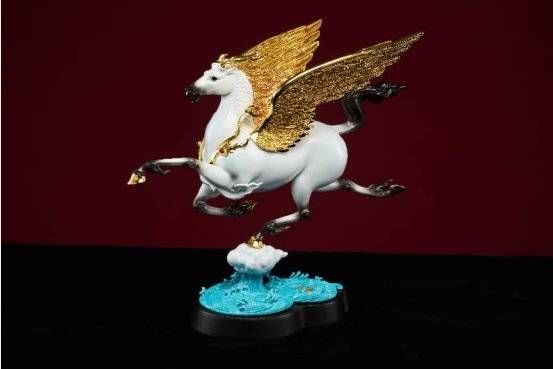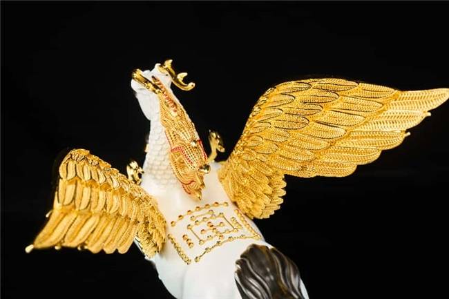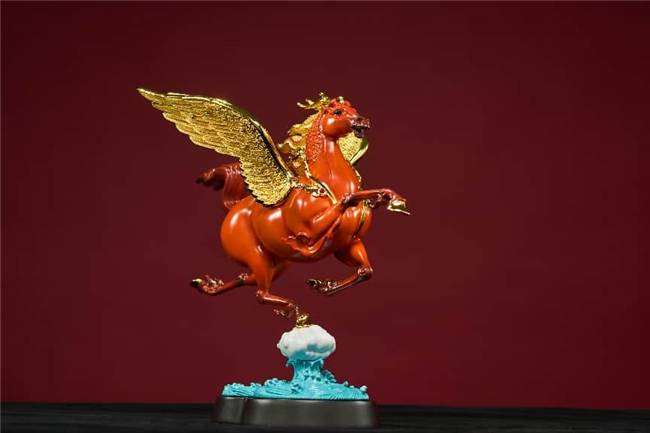《龙马》深植中华文化基因,融合“龙马负图”的文明起源传说、《易经》“天行健”的哲学内核,以及“马踏飞燕”的经典艺术语言。细节处蕴含传统相马智慧:眼如悬铃象征洞察先机,嘴阔鼻粗彰显磅礴气势,蹄踏祥云寓意行稳致远,腰腹饱满展现直冲云霄的力量,尤其是以花丝镶嵌技艺打造的翅膀,它象征着突破常规、挣脱束缚的勇气,是“奋斗精神”的视觉化表达。